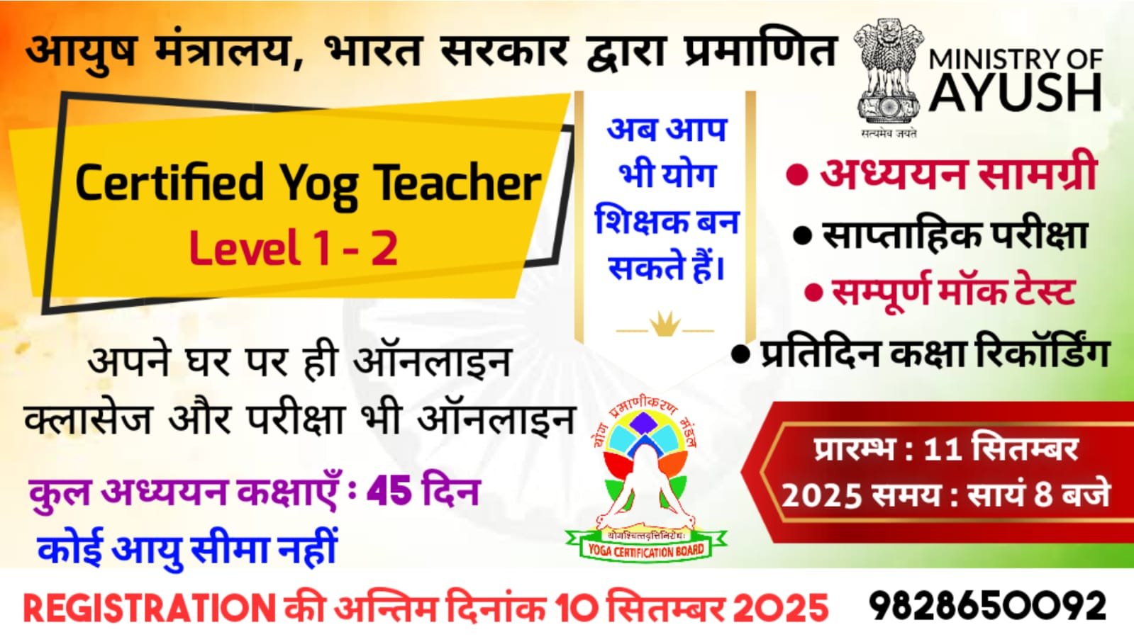 आयुष मंत्रालय, भारत सरकार के Yoga Certification Board (YCB) द्वारा आयोजित परीक्षा की तैयारी के लिए एक विशेष ऑनलाइन योग शिक्षक प्रशिक्षण (Yoga Teacher Training Online Course) शुरू हो रहा है।